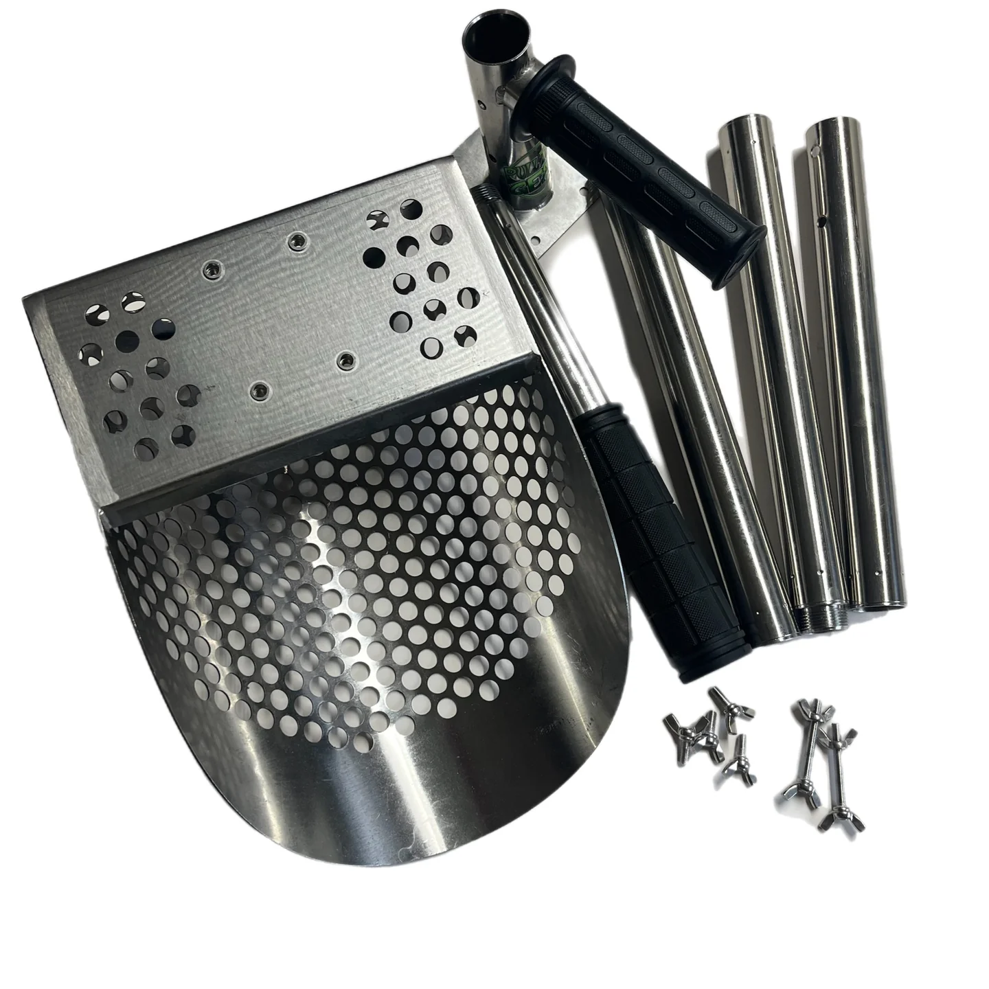 Includes scoop, scoop handle with 4 self threading wing nut screws, one pole base with two wing nut bolts for attaching the pole to the scoop handle, two 10” extensions to adjust your length and finally, the last section of the pole with a comfortable rubber grip.